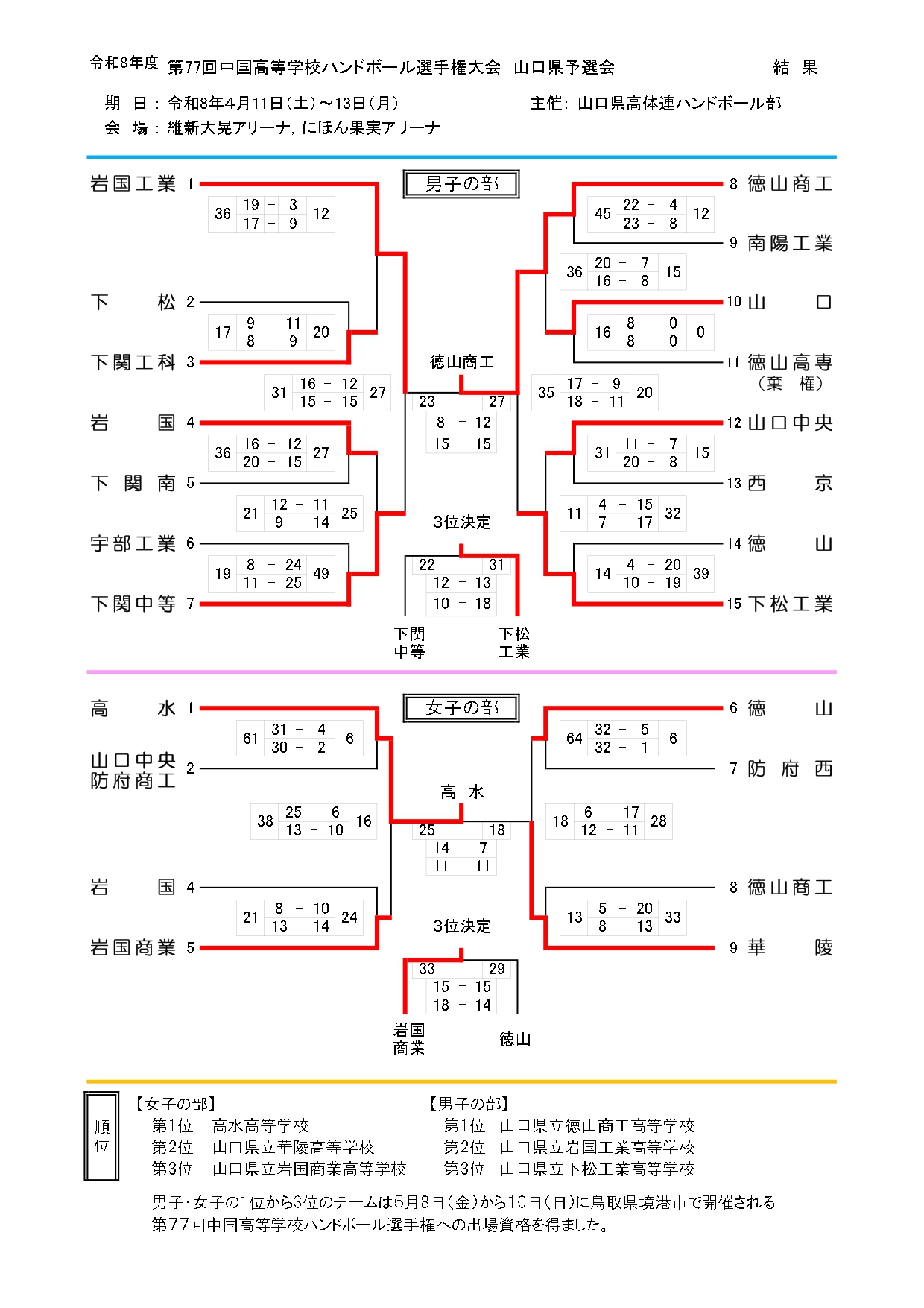 第77回 中国高等学校ハンドボール選手権山口県予選が4月11日(土)~13日(月)まで山口市の維新大晃アリーナ(維新百年記念公園内)で行われました。 試合結果は、以下の通りです。