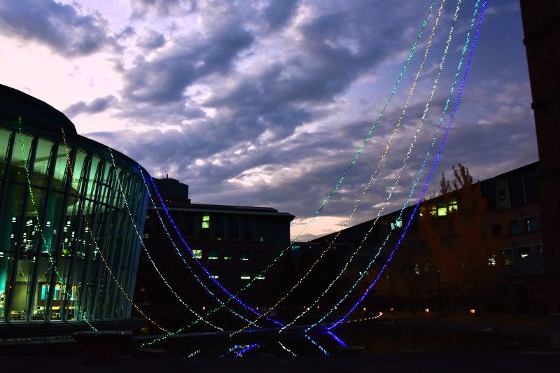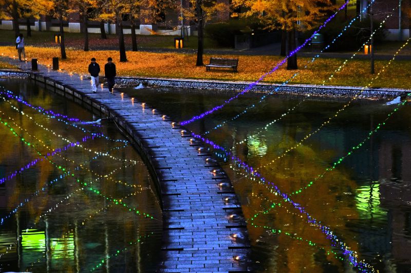 香美キャンパスで、毎年地域の方々に好評を得ているイルミネーションの点灯が始まりました。今年は夕方5時からの点灯で、夕暮れの校舎に彩を添えています(6時以降にはすっかり暗くなりますが、黄昏時のイルミネーションもなかなか味わいがあります)。