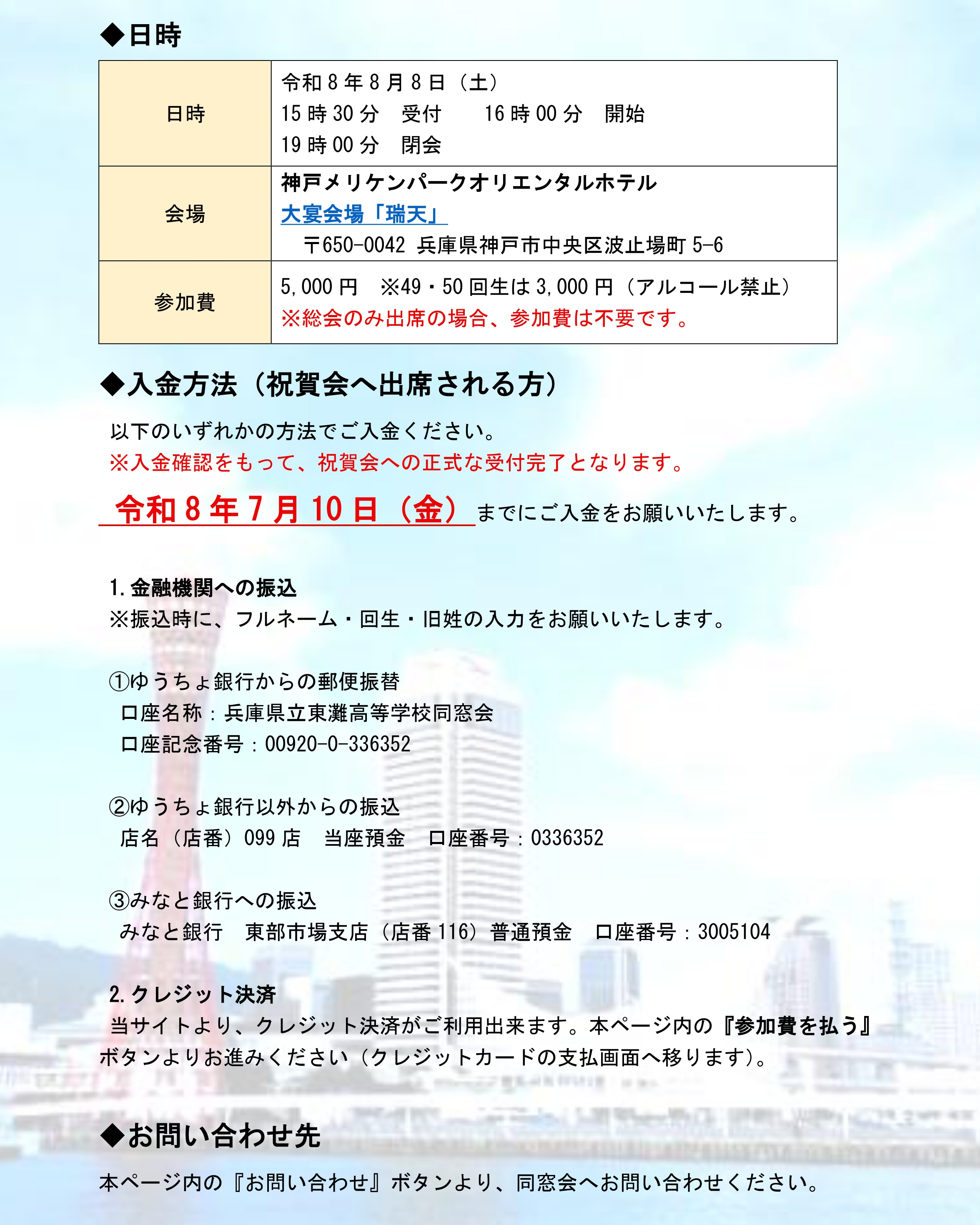 皆様におかれましては、益々ご健勝のこととお慶び申し上げます。 「翔雲会」創立50周年総会・祝賀会を、下記の通り開催することとなりました。 懐かしい思い出話に花を咲かせ、楽しく懇親を深めたいと思います。卒業生の皆様におかれましては何かとご多用とは存じますが、ご臨席賜りますようご案内申し上げます。 ※総会のみ出席の場合、参加費は不要です。 (下記画像をクリックするとPDFが開きます)