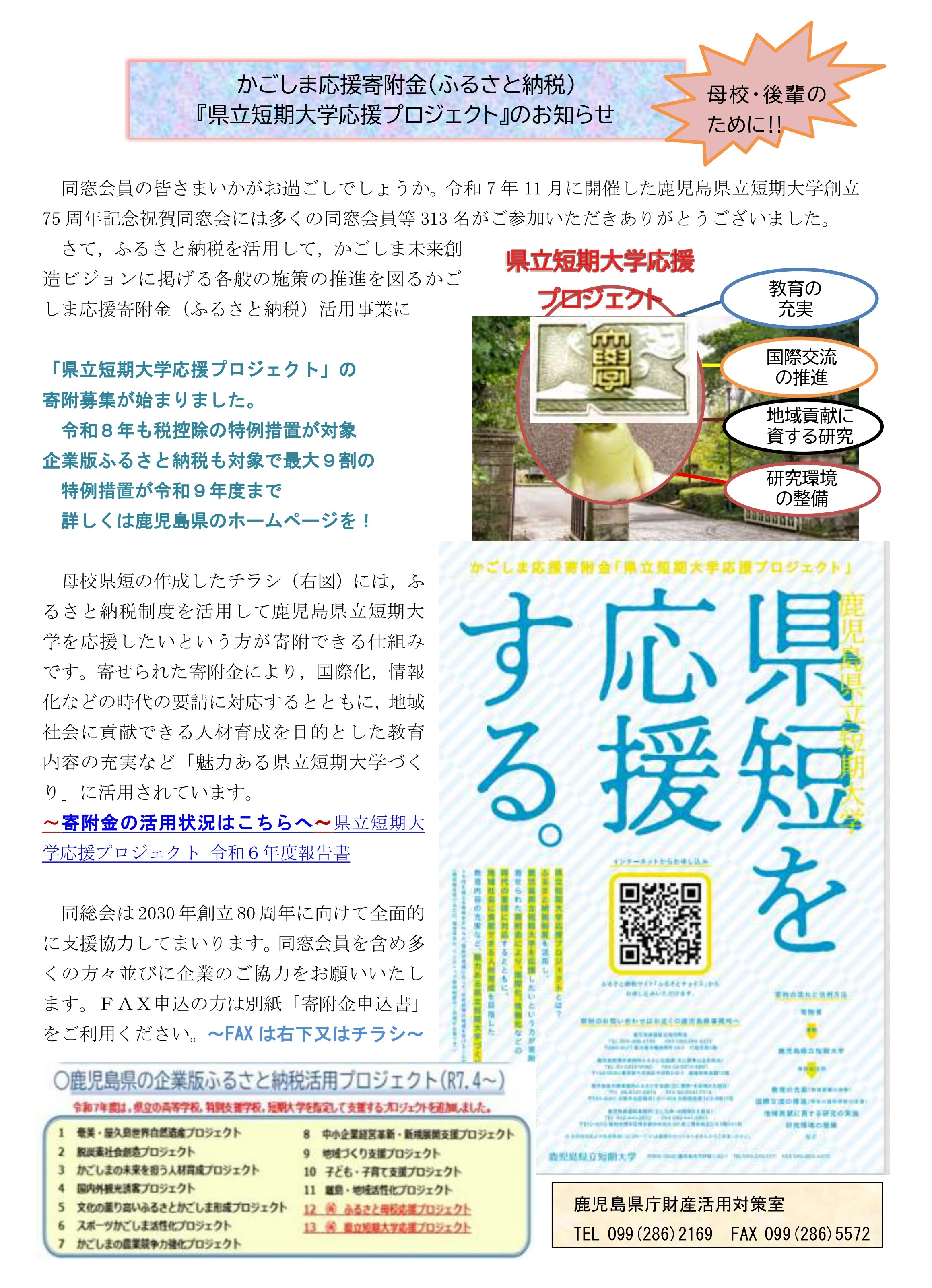 詳細は下記チラシ(クリックするとPDFが開きます)からご確認ください。 また、チラシ内にあります各ホームぺージは下記リンクからもご確認いただけます。 ●鹿児島県ホームページ 鹿児島県/かごしま応援寄附金(ふるさと納税) ●寄附金の活用状況~鹿児島県立短期大学 県立短期大学応援プロジェクト 令和6年度報告書 |