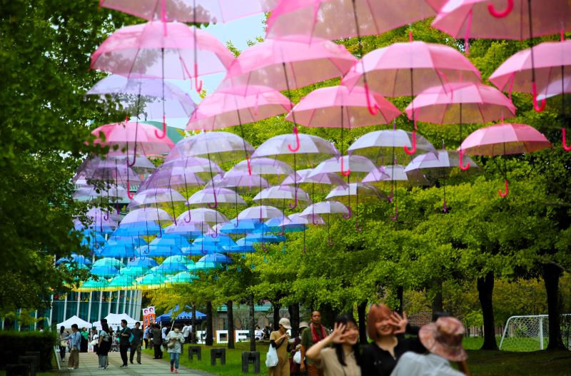 カラフルな傘の下で「はい、チーズ」