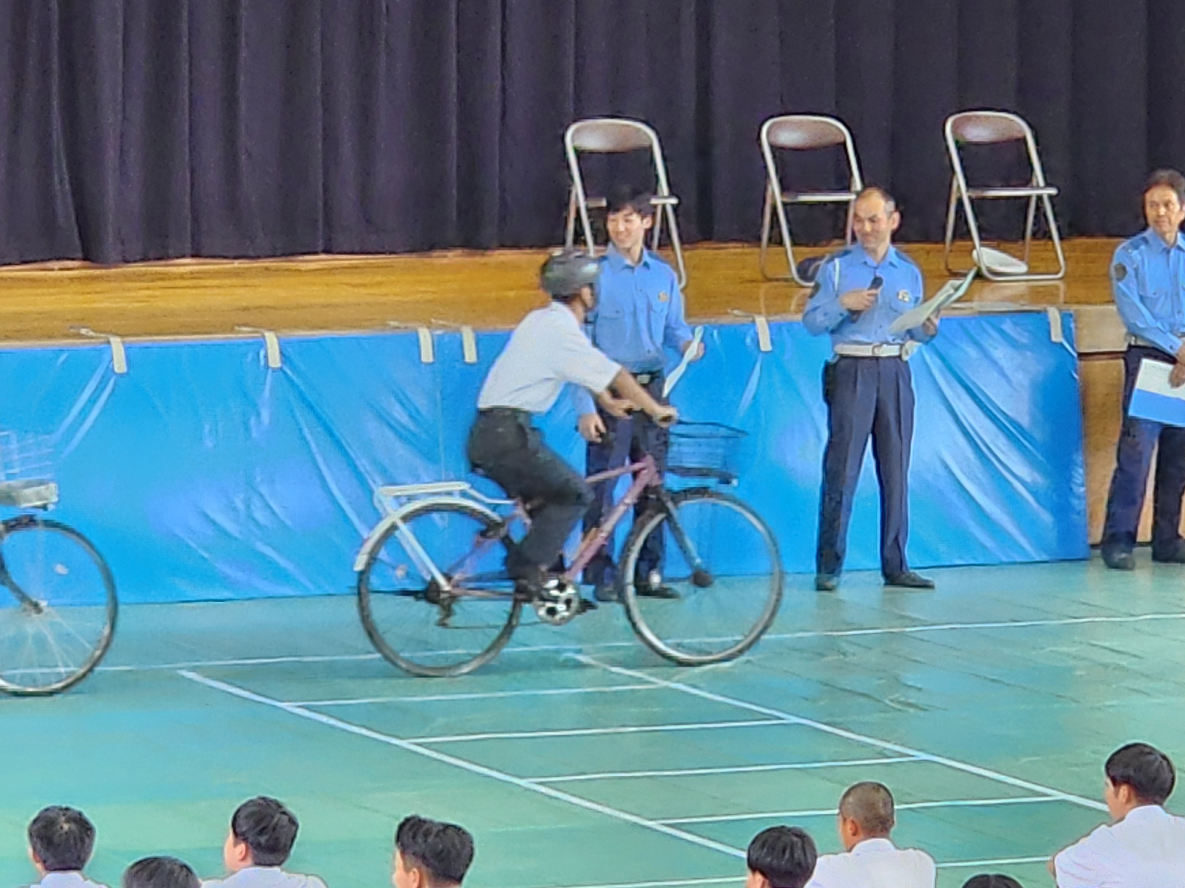 岩国工業高校で交通安全教室が開催され、加納一日署長も参加され、生徒に対して特に自転車での交通安全などについて啓発活動をされました。