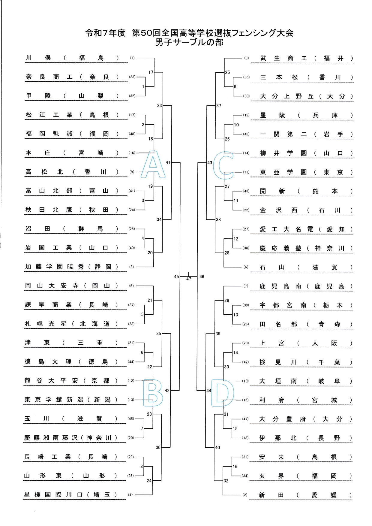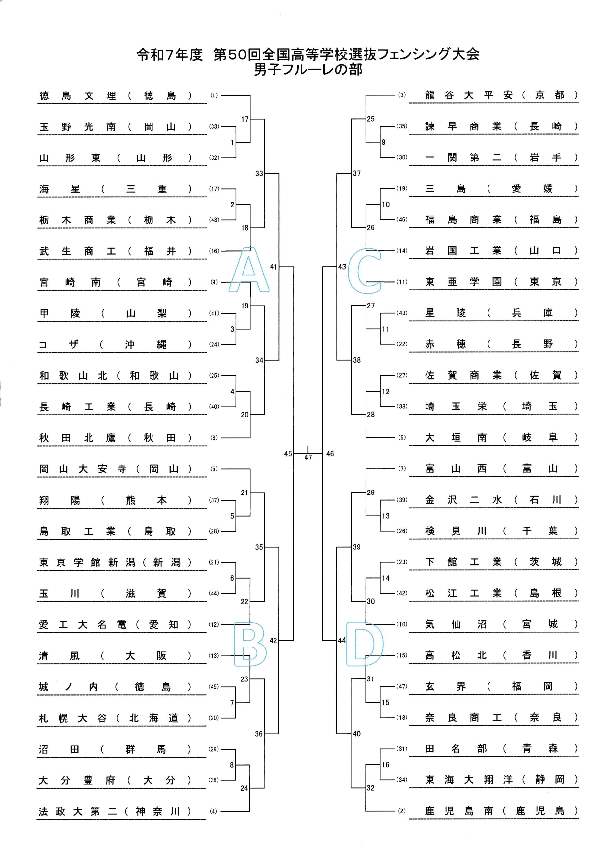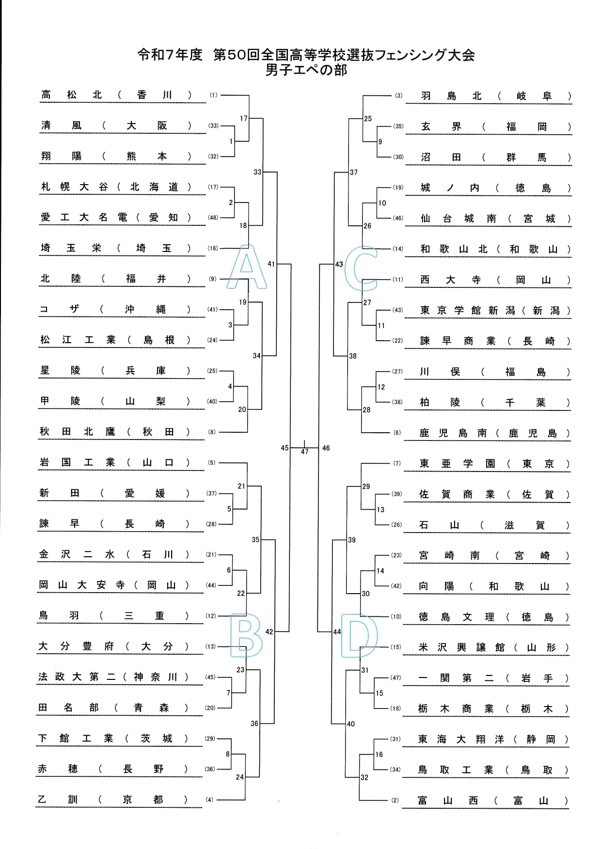 長崎県島原市「島原復興アリーナ」で3月24日(火)~26日(木)まで開催される第50回全国高等学校選抜フェンシング記念大会の組み合わせが決定しましたのでお知らせします。 選抜大会は、各種目すべて団体戦のみです。 岩国工業は、男子はエペ、フルーレ、サーブルのずべて出場。 女子は、エペに出場します。 組合せは以下の通りです。 皆さま、応援よろしくお願いします。