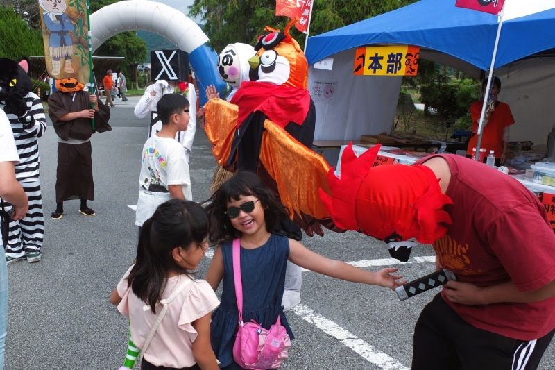 子供たちにも大人気でした今年の衣装テーマは「備蓄米」。時事ネタを盛り込み、〔備蓄米〕と書かれた米俵と、【歩く案山子】と記した新しいのぼりを手作りしました。毎年少しずつ形を変えながら、訪れる人たちにクスッと笑ってもらえるよう工夫を凝らました」。
