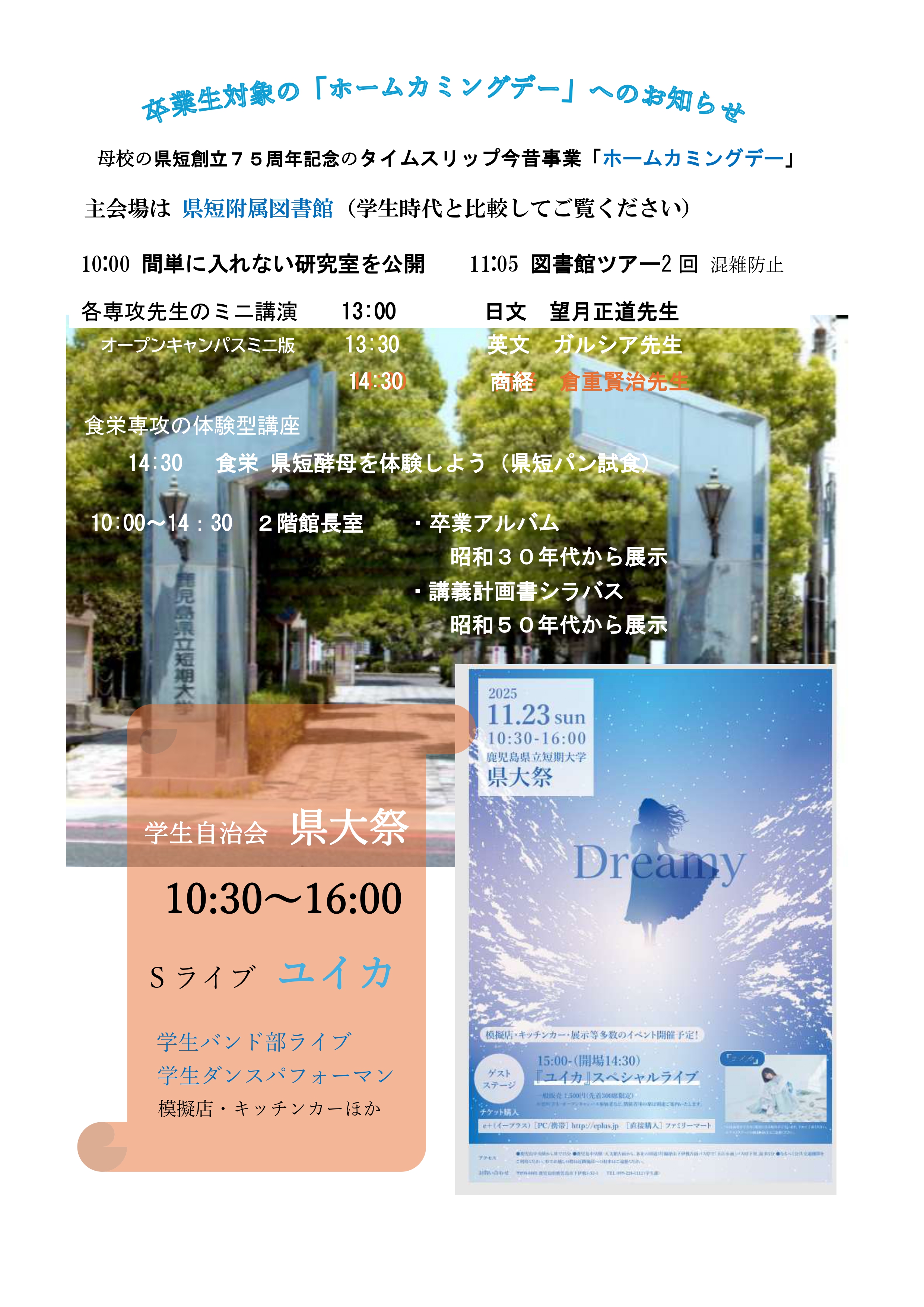 | 母校の県短は今年,創立75周年を迎え,11月23日(日)に卒業生を対象に「ホームカミングデー」を開催します。卒業アルバムは昭和30年代から,講義計画書(シラバス)は昭和50年代から展示されます。またかっては入れなかった研究室や新設された施設もあり,母校がどのように成長したかを実感できます。 卒業アルバムで自分を探し,図書館ツアーの後,各専攻の教室でミニ講座を聴きながら学生時代を思い出してはいかがですか。また学生自治会主催の「県大祭」も開催され,学生バンドのライブなど多彩なイベントのほか模擬店・キッチンカーなどもあります。朝10時に行き,いろいろ見て回り、図書館ツアーの後,学生の作る模擬店で昼食を摂り,午後からオープンキャンパスのミニ版の講義や講演を聴いて,県短酵母の体験型講座に参加しましょう。ホームカミングデーの参加者には創立75周年記念グッズが頂けるとの情報もあります。 これは行かないともったいないです。自分だけでなく友達も誘って,今の母校を実感してください。また翌24日は,鹿児島サンロイヤルホテルで「鹿児島県立短期大学創立75周年記念祝賀同窓会」が盛大に開催されるのでご参加ください。 詳しくは~こちらへ~